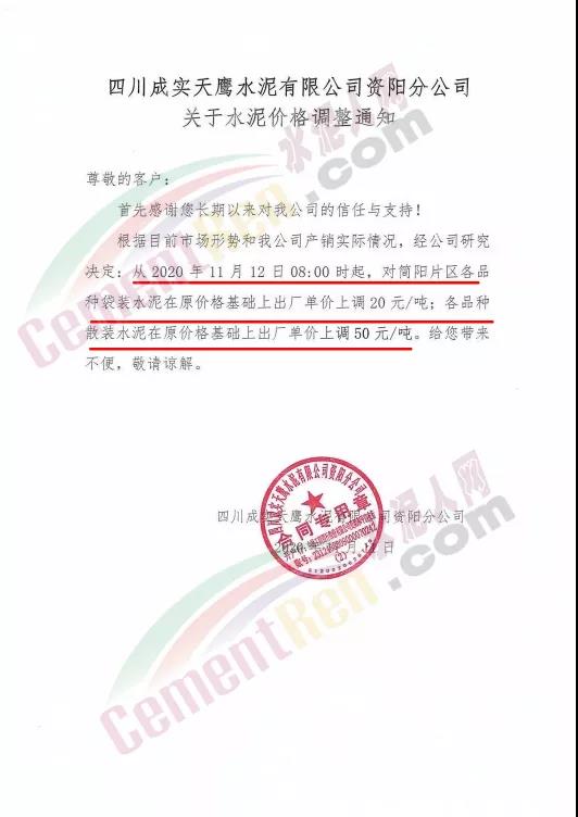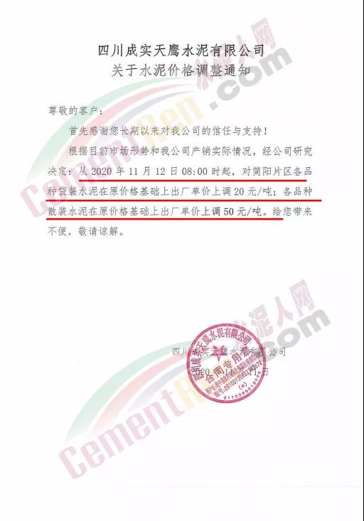 四川成实天鹰水泥、四川成实天鹰水泥资阳分公司等通知自12日起上午8时起,对简阳片区各品种袋装水泥出厂价上调20元/吨。各品种散装水泥上调50元/吨。