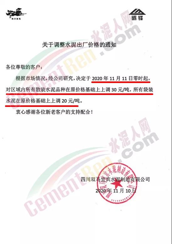 四川双马宜宾水泥通知11月11日零时起对区域内所有散装水泥上调30元/吨,所有袋装水泥上调20元/吨。