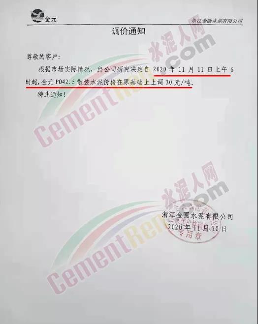 浙江金圆水泥通知11月11日上午6时起,PO42.5散装水泥 上调30元/吨。