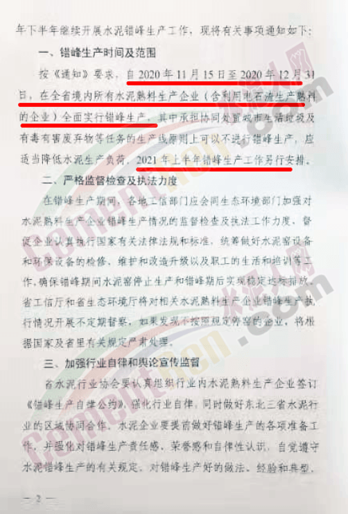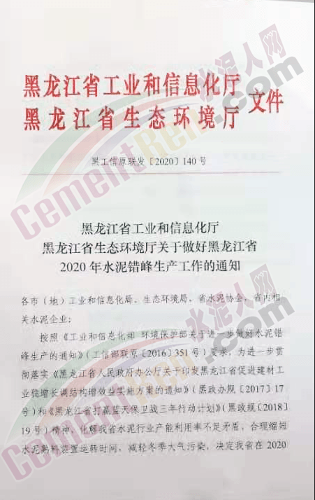 《通知》要求,自2020年11月15日至12月31日,在黑龙江省境内所有水泥熟料生产企业(含利用电石渣生产熟料的企业)全面实行错峰生产,其中承担协同处置城市生活垃圾及有毒有害废弃物等任务的生产线原则上可以不进行错峰生产,应适当降低水泥生产负荷。