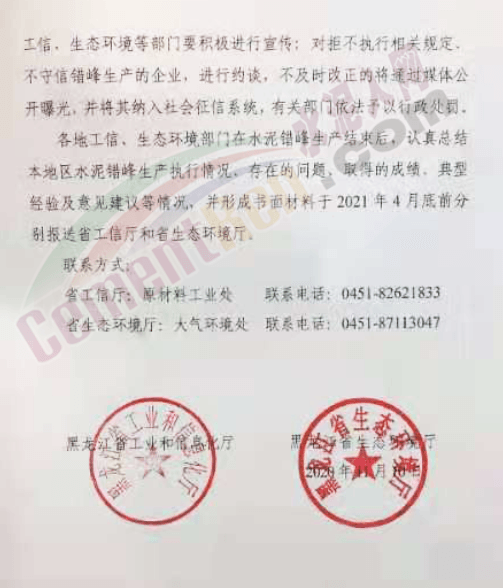 《通知》要求,加强行业自律和舆论宣传监督。黑龙江省水泥行业协会要认真组织行业内水泥熟料生产企业签订《错峰生产自律公约》,强化行业自律,同时做好东北三省水泥行业的区域协同合作。水泥企业要提前做好错峰生产的各项准备工作,并强化对错峰生产责任感、荣誉感和自律性认识,自觉遵守水泥错峰生产的有关规定。对错峰生产好的做法、经验和典型,工信、生态环境等部门要积极进行宣传;对拒不执行相关规定、不守信错峰生产的企业,进行约谈,不及时改正的将通过媒体公开曝光,并将其纳入社会征信系统,有关部门依法予以行政处罚。根据《通知》,黑龙江省各地工信、生态环境部门要在水泥错峰生产结束后,认真总结本地区水泥错峰生产执行情况、存在的问题、取得的成绩、典型经验及意见建议等情况,并形成书面材料于2021年4月底前分别报送黑龙江省工信厅和生态环境厅。