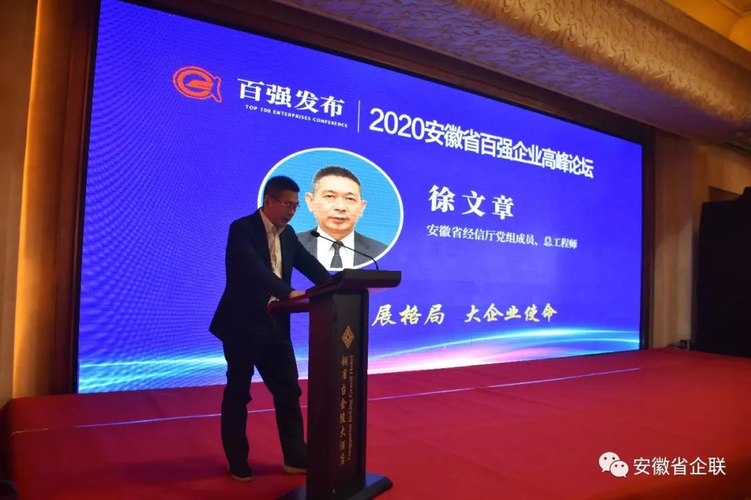 徐文章代表省经信厅向百强企业表示热烈祝贺,向长期以来关心支持我省经济发展和企业成长的社会各界人士表示衷心感谢。他指出百强企业是经济增长的顶梁柱、高质量发展的排头兵,希望各位企业家“不畏浮云遮望眼”,相信市场的力量、创新的力量、品牌的力量,围绕国家战略、产业短板、企业目标,聚焦突破“基础”关、闯过“核心”卡、越过“高端”坎、拓宽“品质”路,做精主业、做强企业,坚定不移走品牌兴企、创新强企的高质量发展之路,为建设“五大发展美好安徽”做出新的更大贡献。徐文章表示,省经信厅将一如既往的在充分“给政策”、低调“搞服务”、大力“优环境”上下功夫,切实当好企业的“娘家人”“贴心人”,携手打好产业基础高级化、产业链现代化的攻坚战。