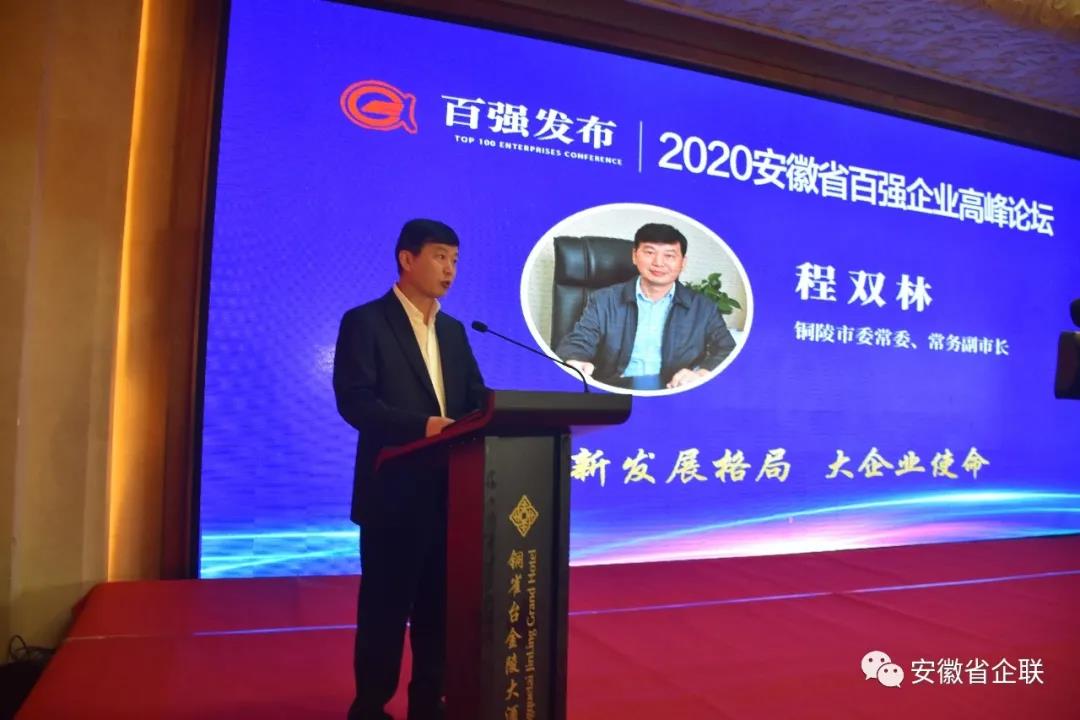 程双林代表铜陵市委市政府对大会的召开表示热烈祝贺,对各位领导嘉宾的到来表示诚挚欢迎。他说,企业是市场的主体,是推动经济社会发展的重要力量,省企联连续16年对百强企业做出排序,是促进我省企业做实做优、做大做强的重要举措,激励了广大企业和企业家砥砺奋进、勇作先锋,凝聚了全社会尊重企业、弘扬企业家精神、加快创新创业创造的强大力量,为推动我省高质量发展作出了重要贡献。程双林表示,铜陵产业基础雄厚、发展平台完善、交通条件优越、营商环境良好。希望广大企业家能够把握铜陵发展的重大机遇,选择铜陵、投资铜陵、加码铜陵,带动更多企业来铜共谋发展,共创未来。我们将坚持“无事不扰、有求必应”,坚持客户思维、用户体验,竭力提供最优服务、最强保障,全力为企业发展“保驾护航”。