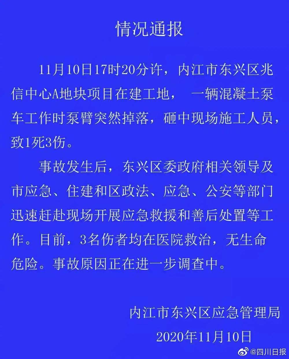 11月10日,有网友爆料称,内江市东兴区兆信中心在建工地发生事故导致人员伤亡。记者从内江市东兴区应急管理局处确认,11月10日17时20分许,内江市东兴区兆信中心A地块项目在建工地,一辆混凝土泵车工作时泵臂突然掉落,砸中现场施工人员,致1死3伤。 内江市东兴区应急管理局11月10日晚间发布情况通报称,事故发生后,东兴区委政府相关领导及市应急、住建和区政法、应急、公安等部门迅速赶赴现场开展应急救援和善后处置等工作。目前,3名伤者均在医院救治,无生命危险。事故原因正在进一步调查中。