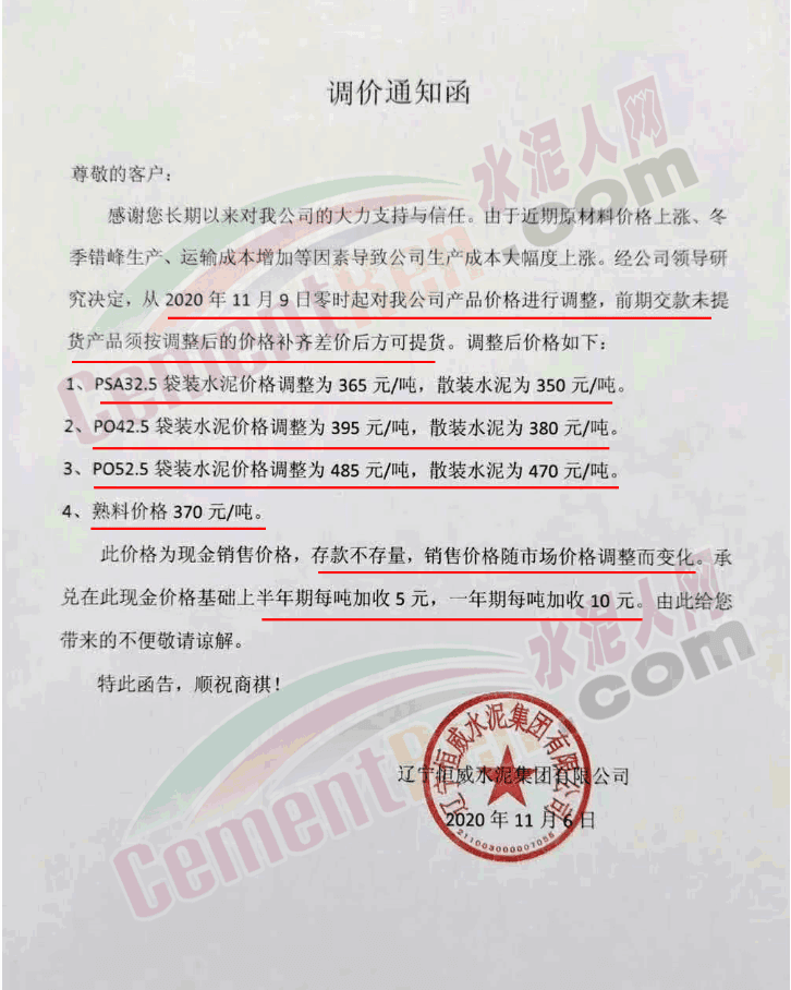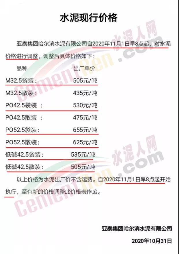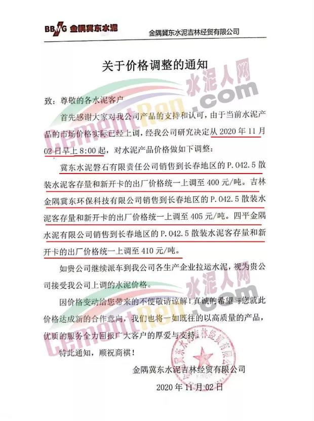 据水泥人网此前报道,近期多区域通知上调水泥价格,东北吉林某企业通知水泥价格一次性上调160元/吨,黑龙江主要品牌企业北方水泥、亚泰水泥一次性上调130~150元/吨。