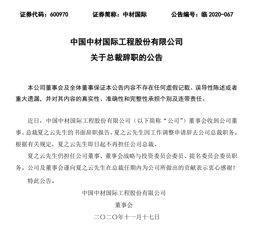中国中材国际工程股份有限公司董事会收到公司董事、总裁夏之云先生的书面辞职报告,夏之云先生因工作调整申请辞去公司总裁职务。根据有关规定,夏之云先生即日起不再担任公司总裁。