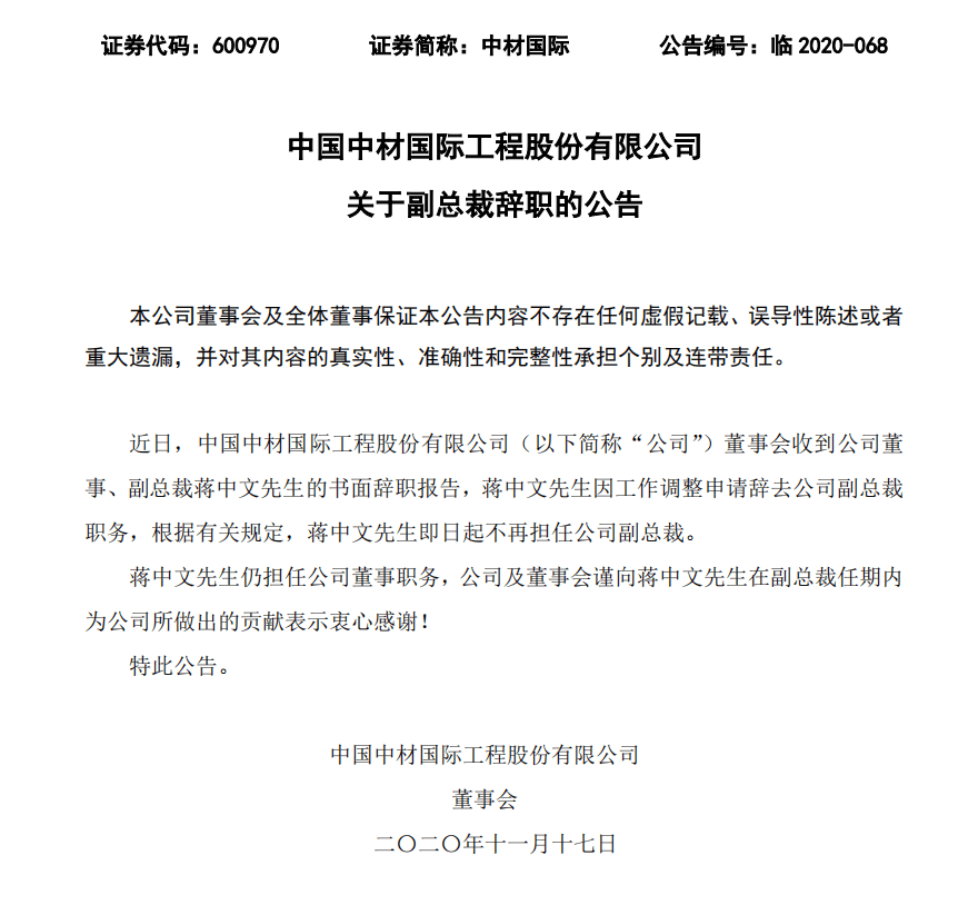近日,中国中材国际工程股份有限公司董事会收到公司董事、副总裁蒋中文先生的书面辞职报告,蒋中文先生因工作调整申请辞去公司副总裁职务,根据有关规定,蒋中文先生即日起不再担任公司副总裁。