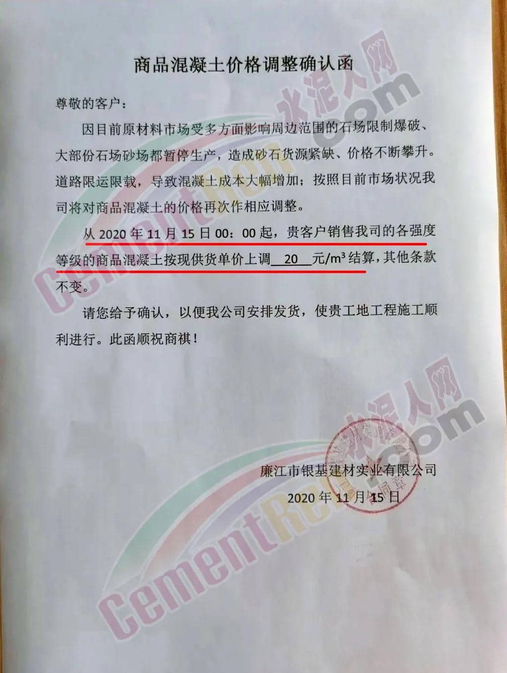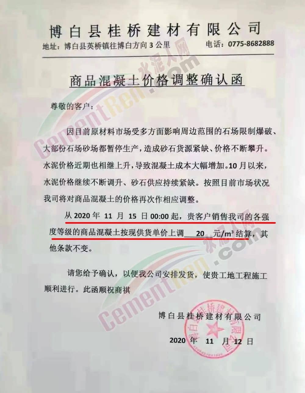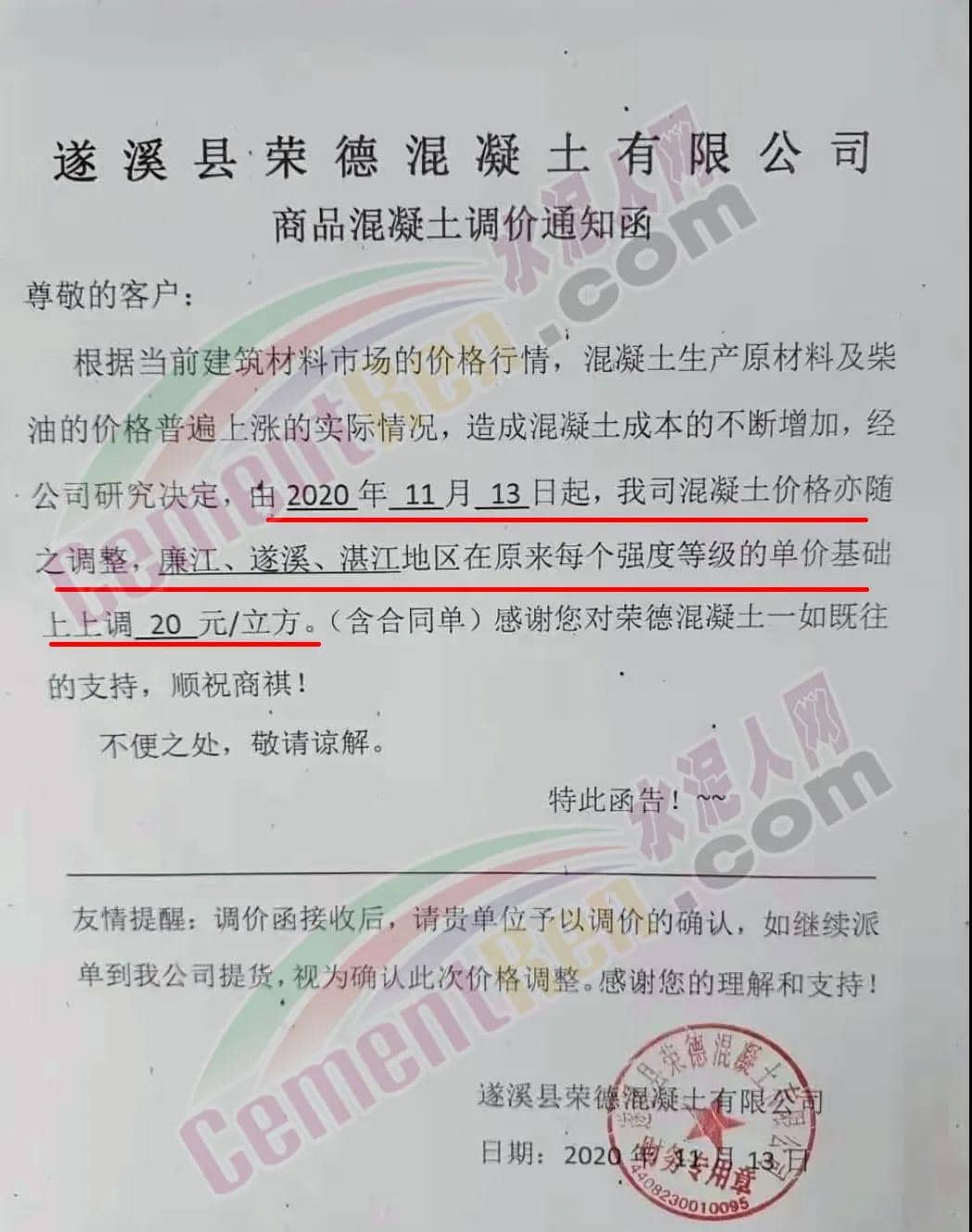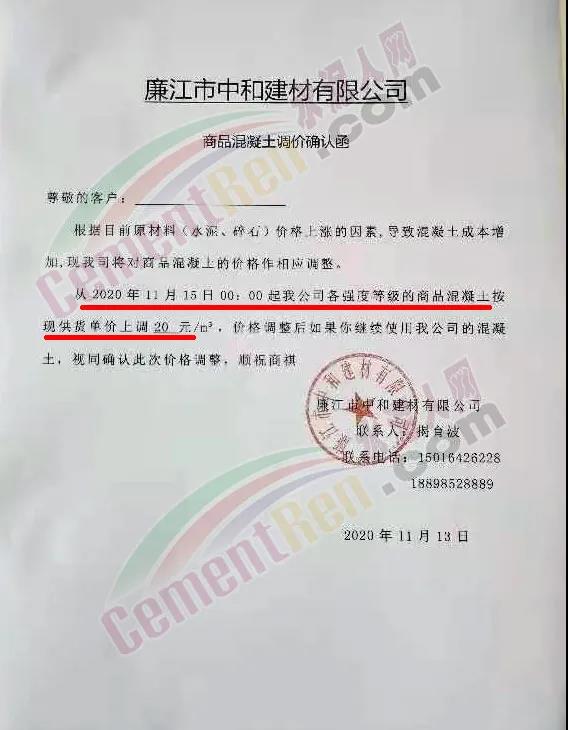 廉江市中和建材有限公司通知,根据目前原材料(水泥、碎石)价格上涨的因素,导致混凝土成本增加,公司对商品混凝土的价格作相应调整。从2020年11 月15日0时起我公司各强度等级的商品混凝土按现供货单价上调 20 元/立方 。
