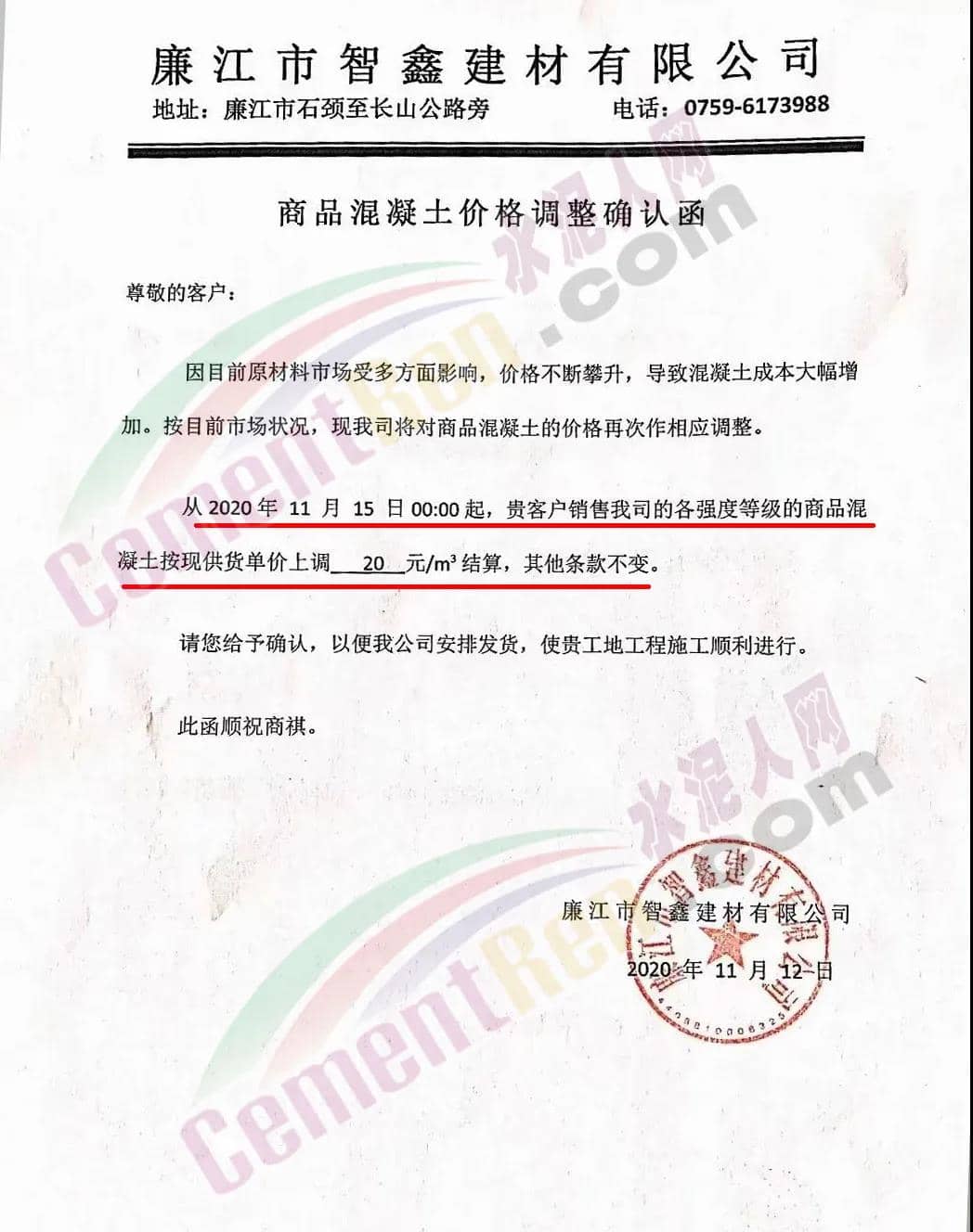 廉江市智鑫建材有限公司通知,因目前原材料市场受多方面影响,价格不断攀升,导致混凝土成本大幅增加。按目前市场状况,公司对商品混凝土的价格再次作相应调整。从2020年11月15日0时起,公司各强度等级的商品混凝土按现供货价格上调20元/方结算,其他条款不变。