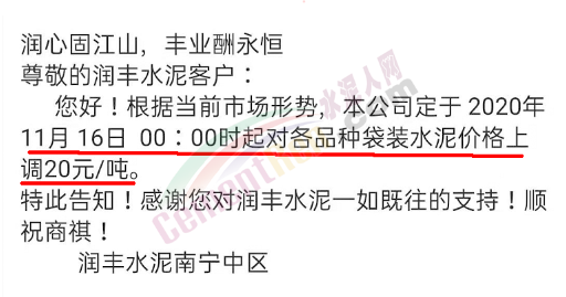 润丰水泥南宁中区通知根据当前市场形势,公司定于 2020年11月16日 00∶00时起对各品种袋装水泥价格上调20元/吨。