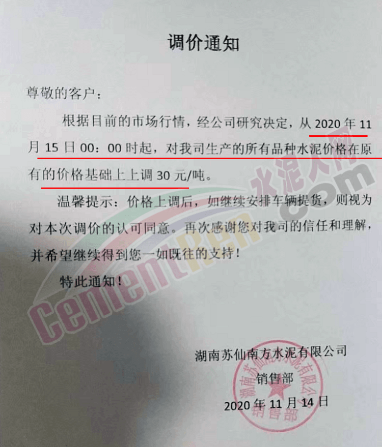 湖南苏仙南方水泥通知,11月15日0时起上调30元/吨。