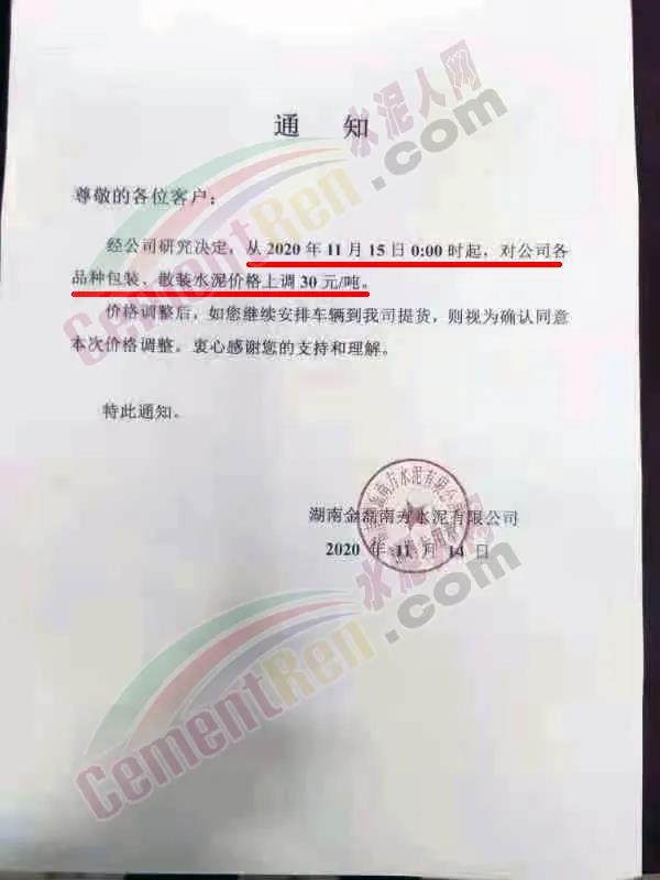 湖南金磊南方水泥通知11月15日0时起,上调各品种包装和散装水泥价格30元/吨。
