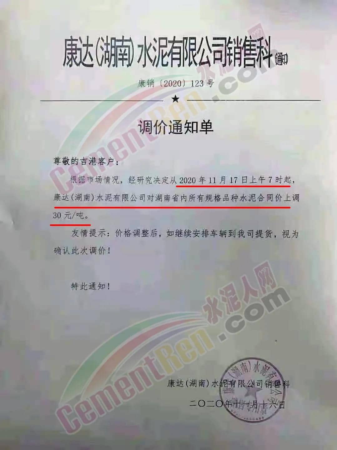 红狮水泥旗下康达(湖南)水泥有限公司通知11月17日上午7时起对湖南省内所有规格品种水泥合格价上调30元/吨。