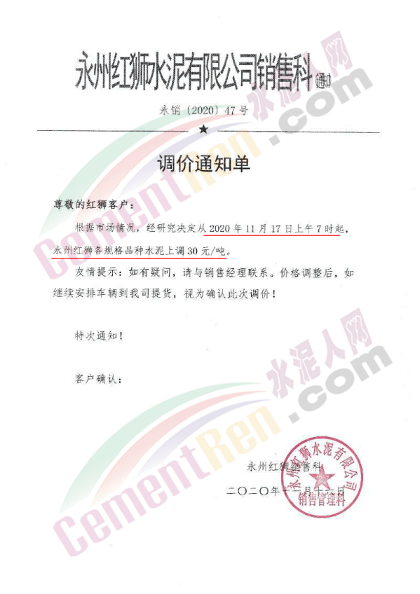 湖南永州红狮水泥销售科通知,自11月17日上午7时起,永州红狮各规格品种水泥上调30元/吨。