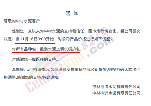 中材湘潭水泥有限责任公司(中材株洲水泥有限责任公司)通知自11月16日0:00开始,对公司所有品种包、散装水泥上调30元/吨。