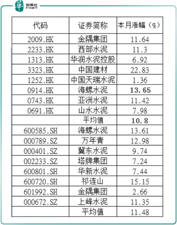 据Wind数据显示,截至2020年11月02日至11月17日收盘,A股水泥板块中,股价累计涨幅跑赢所属板块的企业有海螺水泥(600585-SH)、万年青(000789-SZ)、祁连山(600720-SH);H股水泥股板块中,股价累计涨幅跑赢所属板块的企业有金隅集团(02009-HK)、西部水泥(02233-HK)、中国建材(03323-HK)、海螺水泥(00914-HK)、亚洲水泥(00743-HK)。