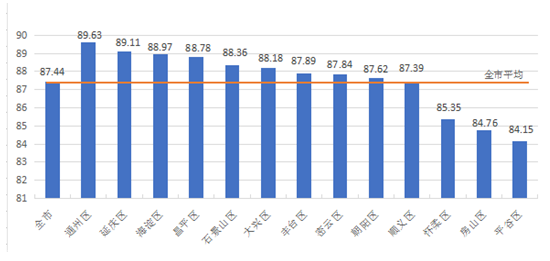 各区企业现场检查平均分见图1。本次企业现场评估平均分较高的有通州区、延庆区和海淀区,分数较低的有平谷区、房山区和怀柔区。与第二次评估时现场得分排名相比,延庆区和通州区排名提升较多。(各区企业现场评估得分情况详见附件2)