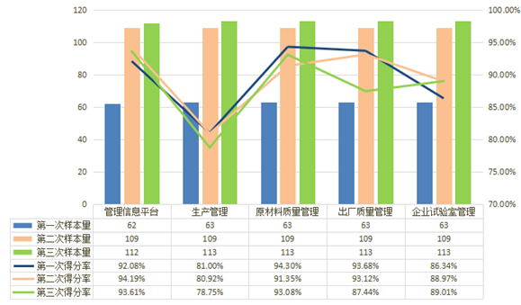 其中,管理信息平台、原材料质量管理两项指标的平均得分率均超过了90%,企业试验室的得分率接近90%(为89.01%),生产管理低于80%。具体得分率分布及与第一次和第二次平均得分情况的对比见图2。