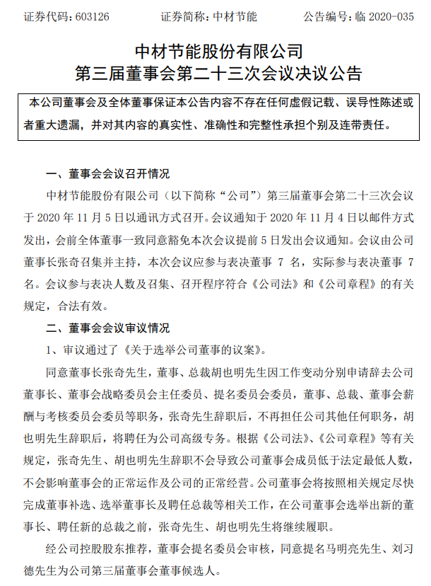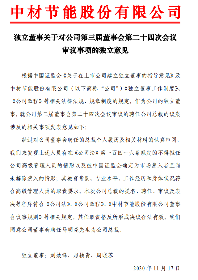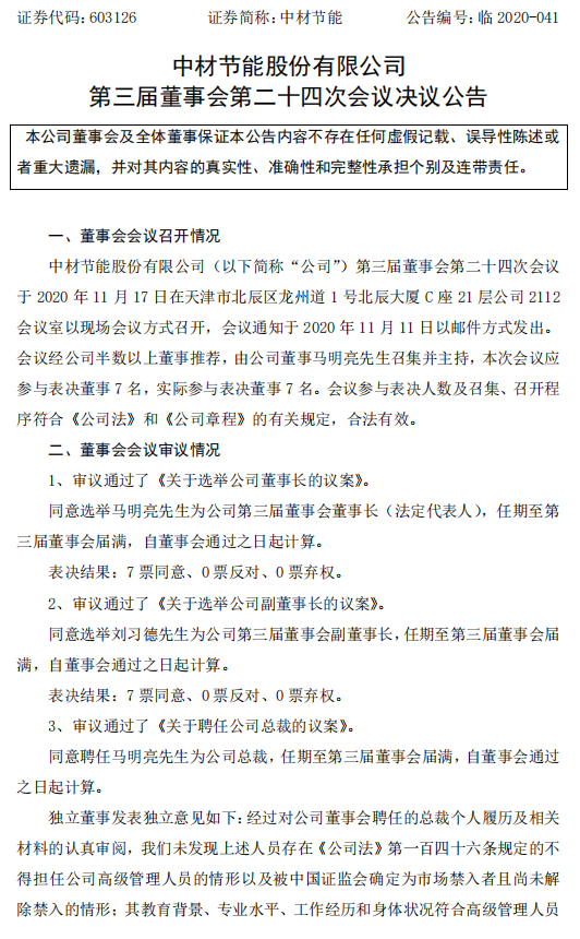 1、胡也明离职总裁职位,离职时间为2020年11月17日,离职原因为:工作变动。2、付贵平上任副总经理职位,上任时间为2020年11月17日。3、马明亮上任总裁职位,上任时间为2020年11月17日。中材节能股份有限公司是中材集团旗下从事余热、余压利用的余热发电全方位服务商。中材节能致力于工业余热、余压的技术开发、综合利用和产业化,拥有该领域及相关领域的设计、对外贸易经营以及对外工程总承包等各类经营资质,主要从事余热发电项目的投资、技术开发、系统集成、工程设计、咨询及工程总承包,提供清洁发展机制项目的开发方案及技术咨询.中材节能也是经国家商务部批准的承包境外低温余热发电系统工程和境内国际招标工程等业务的公司。
