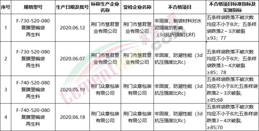 抽查结果显示,水泥包装。抽查全省29家企业生产的60批次水泥包装袋,检测发现4批次产品不合格,不合格发现率为6.67%。不合格项目为牢固度、防潮性,属一般不合格。