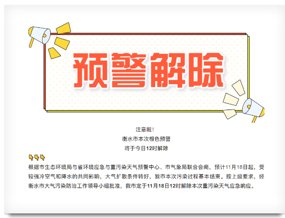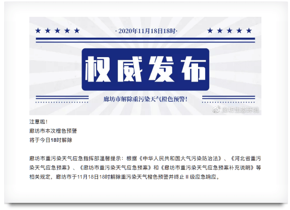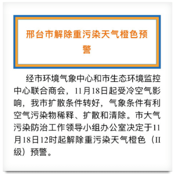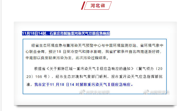 河北保定市11月18日16时解除重污染天气II级(橙色)应急响应措施。 根据省大气办《关于解除区域一重污染天气II级应急响应的通知》冀气领办2020166号),预计2020年11月18日起,受冷空气和降水影响,保定市空气质量逐步改善,污染过程基本结束。经市政府批准,保定市于11月18日16时解除重污染天气II级(橙色)应急响应措施。