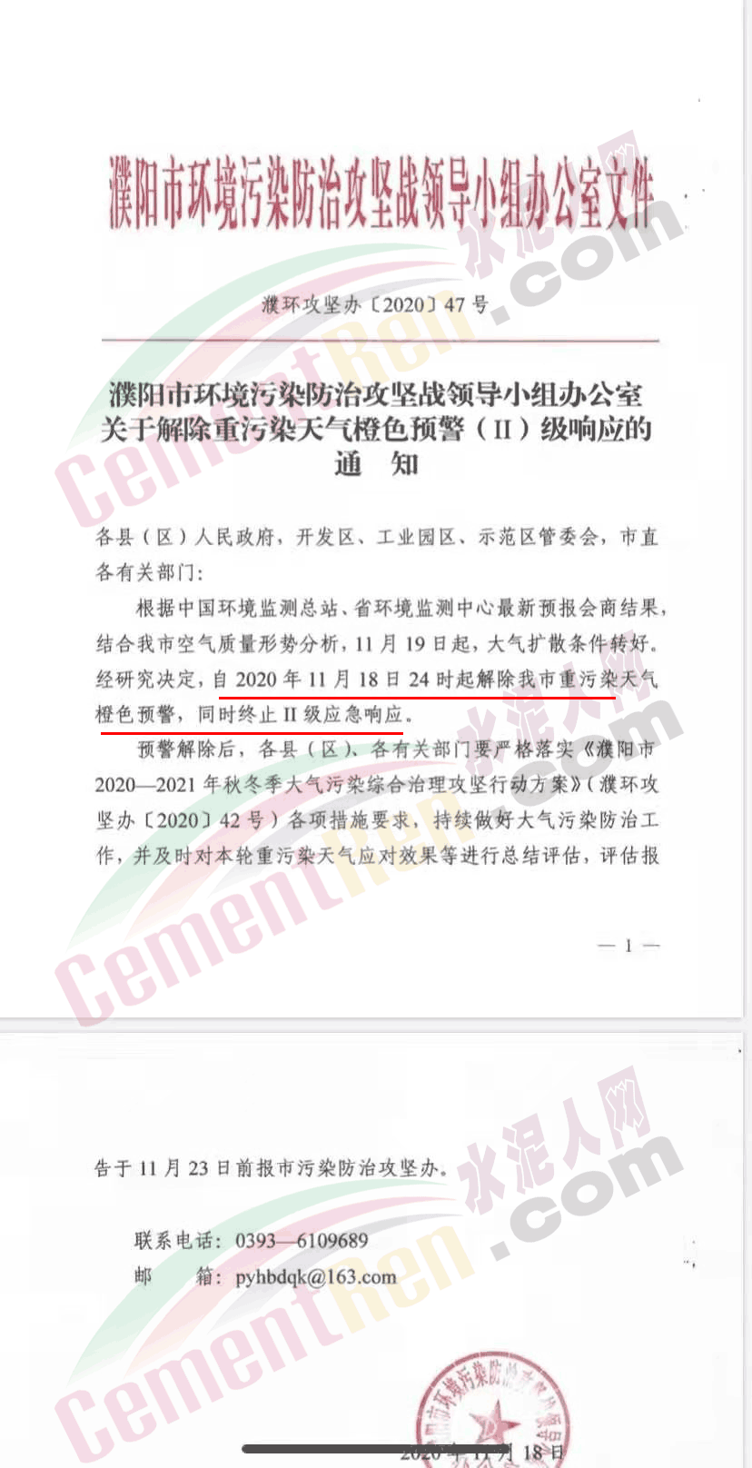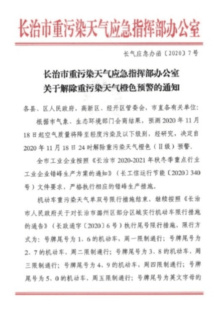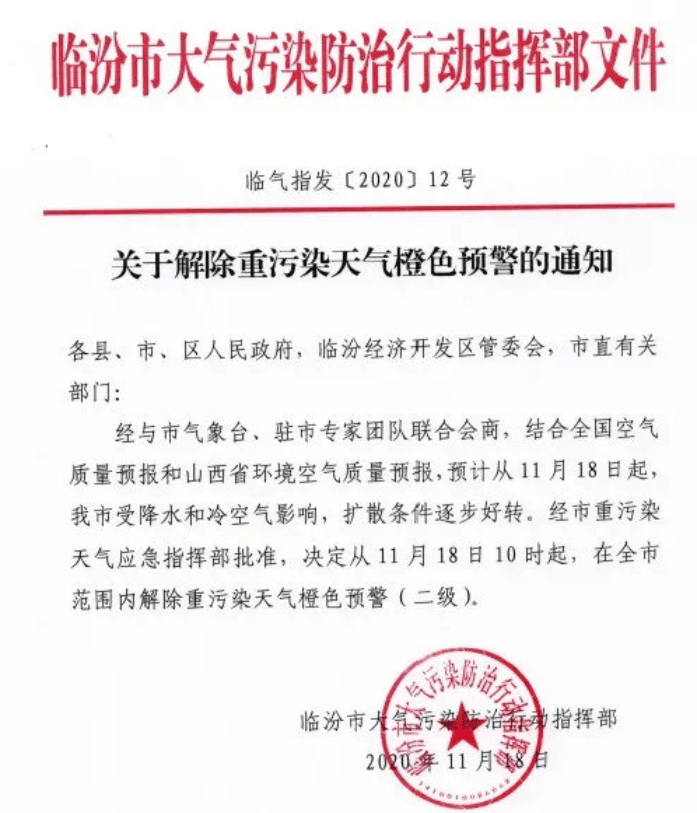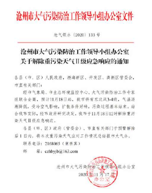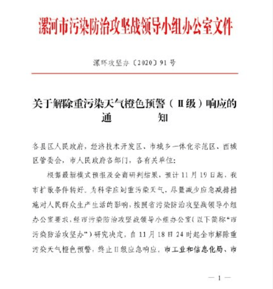 根据中国环境监测总站、区域预报中心和省生态环境监测中心联合会商结果,预计11月19日起,扩散条件转好。经省污染防治攻坚战领导小组办公室研究决定,为科学应对重污染天气,尽量减少应急减排措施对人民群众生产生活的影响,按照省攻坚办《关于解除重污染天气预响应的通知》要求,经市环境攻坚办研究决定,于2020年11月18日24时解除我市重污染天气预警,终止应急响应。此次重污染天气应对工作,各级各有关部门高度重视,积极采取管控措施,尽最大努力减少污染物排放,取得较好的成效。11月19至20日,全省大部分区域部分时段可能还会出现轻度污染。按照省攻坚办要求,各县、区政府及市重污染天气管控各成员单位应加强季节性管控和治理措施,并认真做好本次橙色预警(II 级)响应阶段的评估工作。请各县、区和各市成员单位于11月21日下午18:00时前将本县区(部门)重污染天气应急响应评估报告报送至市环境攻坚办应急部。联 系 人:苏 华邮 箱:gjbyjz@163.com联系电话:23620015、22660121