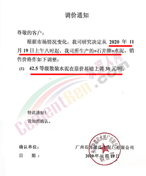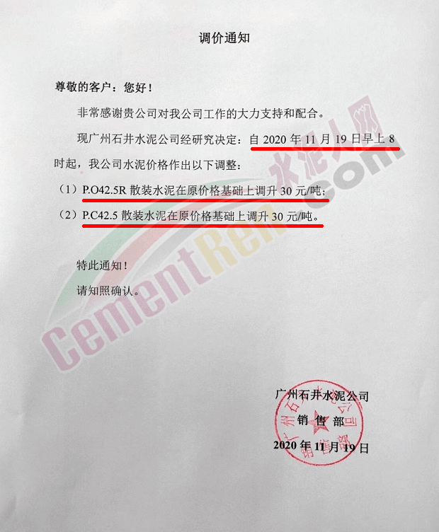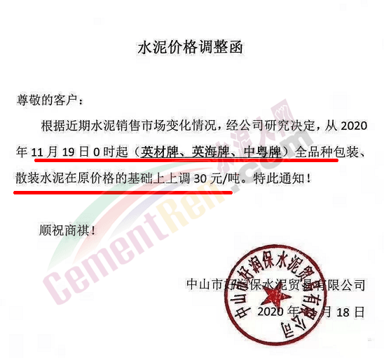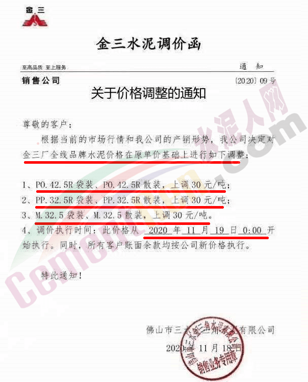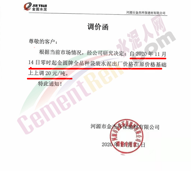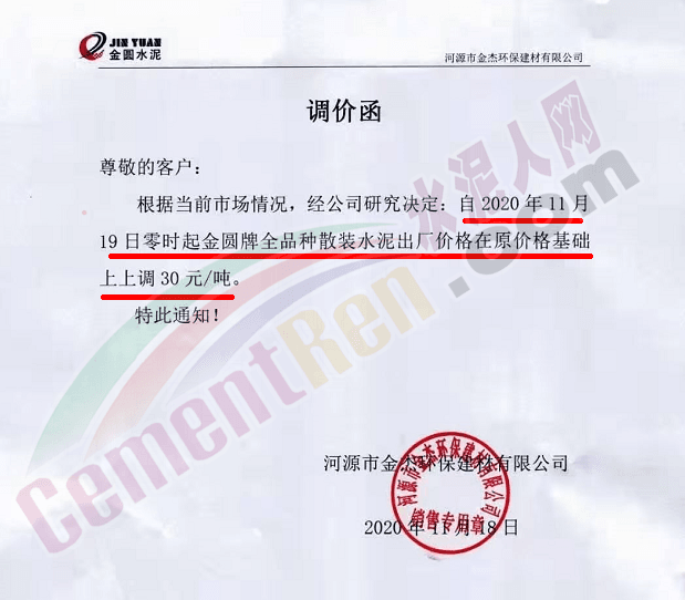 金圆水泥通知,11月19日0时各品种散装水泥上调30元/吨,本月14日,金圆水泥还曾上调全品种袋装水泥20元/吨。
