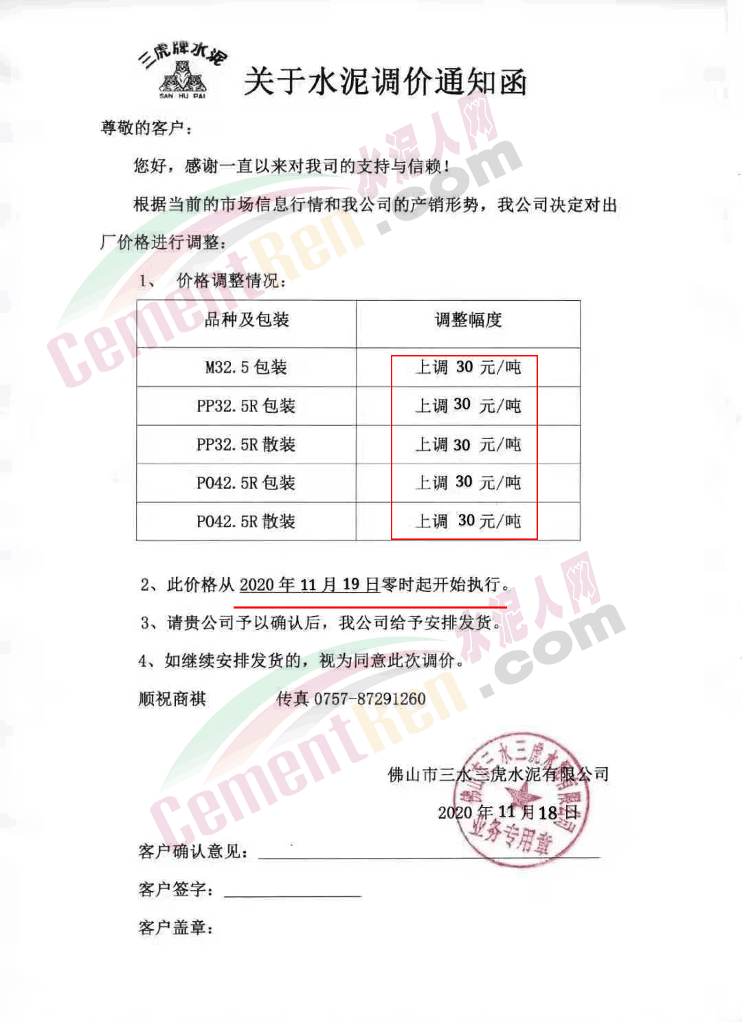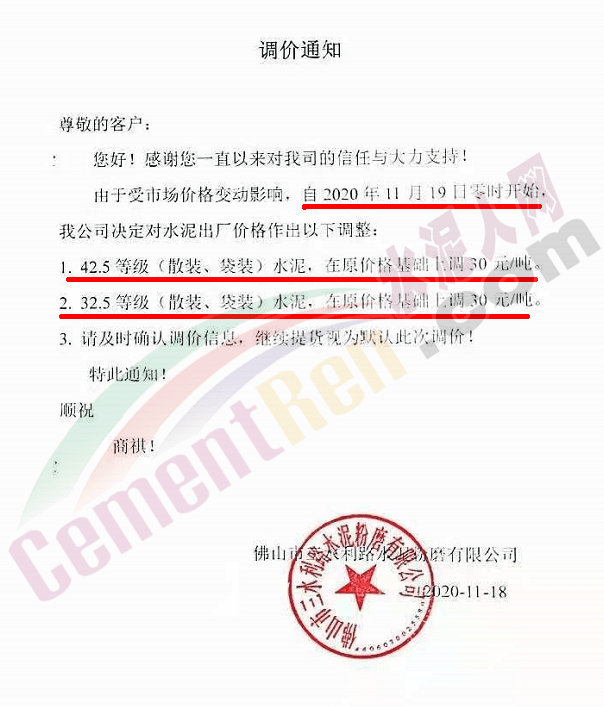 佛山市三水三虎水泥通知自今日(19日)零时起各标号水泥上调30元/吨。