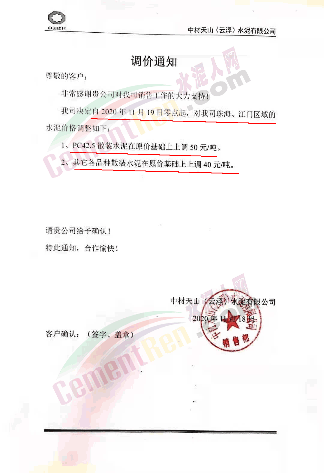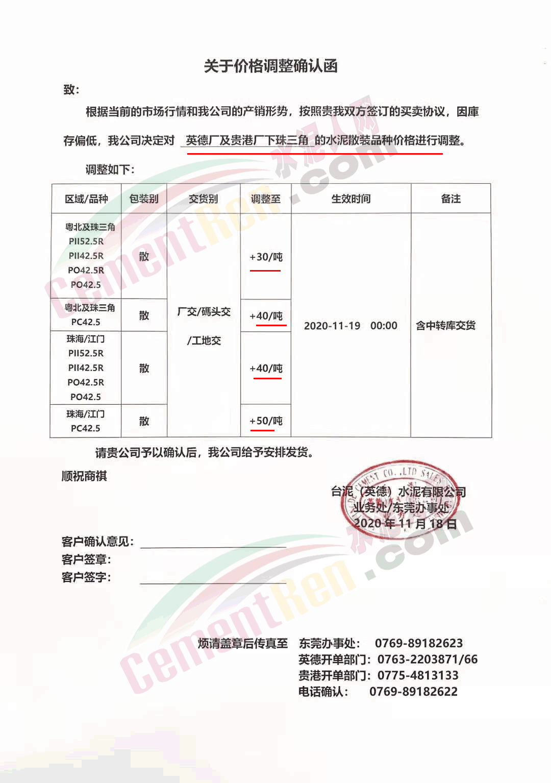 台泥英德水泥有限公司通知,因库存偏低,英德厂及贵港厂下珠三角的水泥散装品种价格进行调整 。其中粤北及珠三角区域高标号散装水泥上调30元/吨,PC42.5散装水泥上调40元/吨。珠海/江门区域高标号散装水泥上调40元/吨,PC42.5散装水泥上调50元/吨。自今日(19日)0时起执行。调价含中转库交货。