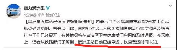 内蒙古满洲里市所有人员核酸检测,火车停运、学校停课、公共场所暂停营业!