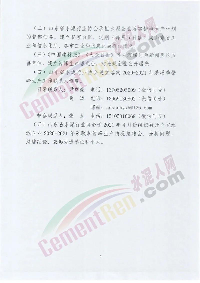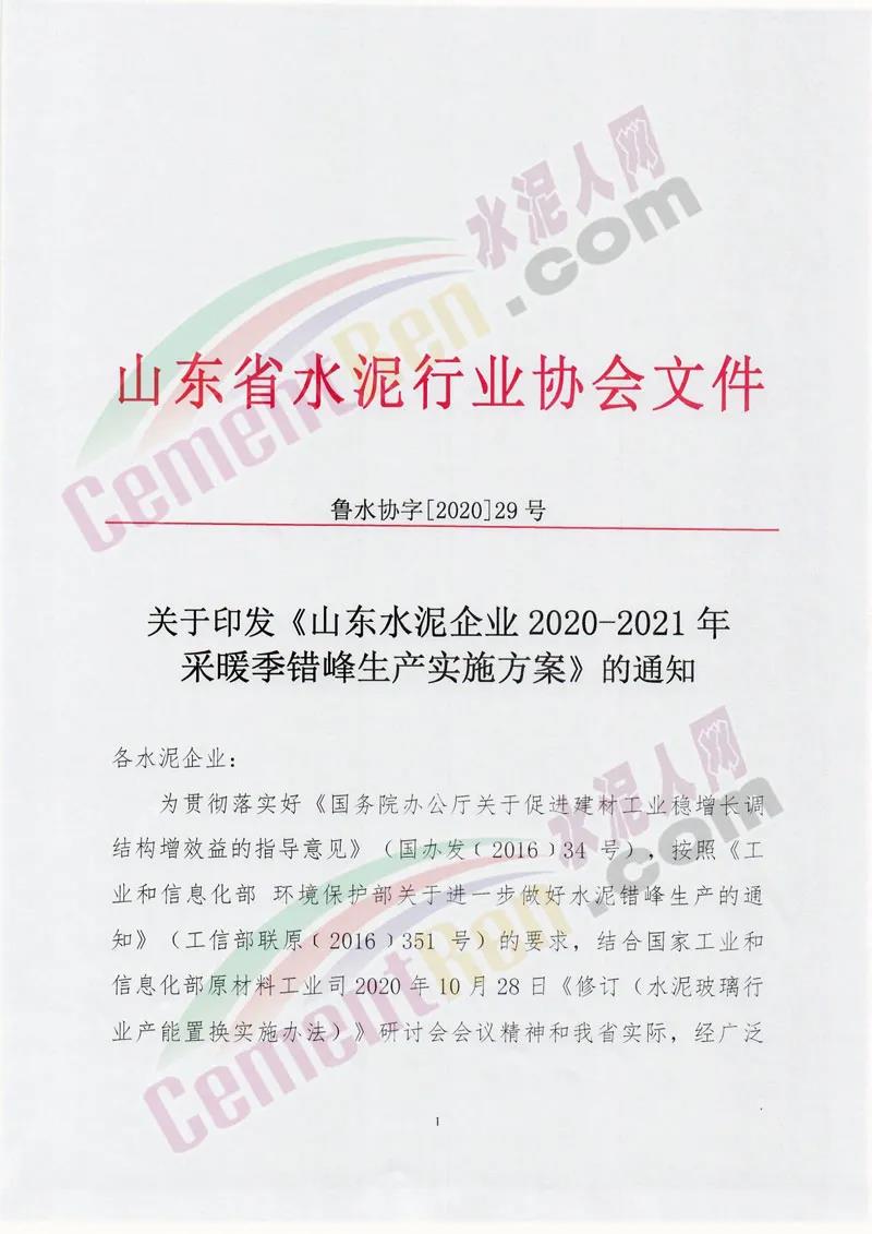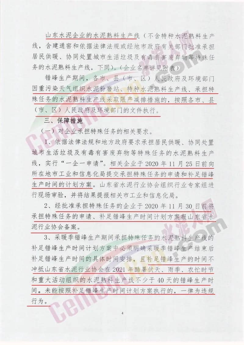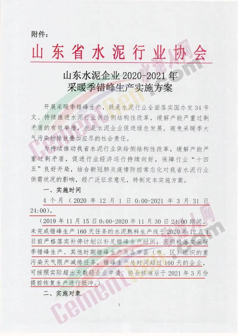 3、釆暖季错峰生产期间承担特殊任务的水泥熟料生产线的补足错峰生产时间计划方案中必须明确采暖季错峰生产结束后 补足错峰生产时间的具体时间安排,且补足错峰生产的时间不冲抵山东省水泥行业协会在2021年酷暑优天、雨季、农忙时节 和重大活动组织的水泥熟料生产线不少于40天的错峰生产时 间。未能按照补足错峰生产时间计划方案执行的,一律为违规行为。通知原文如下: