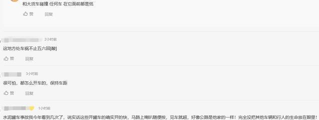 “很可怕,都怎么开车的,保持车距。”“水泥罐车事故我今年看到几次了,说实话这些开罐车的确实开得快,马路上喇叭随便按,见车就超,好像公路是他家的一样!完全没把其他车辆和行人的生命放在眼里!”“和大货车碰撞任何车在它面前都是纸。”