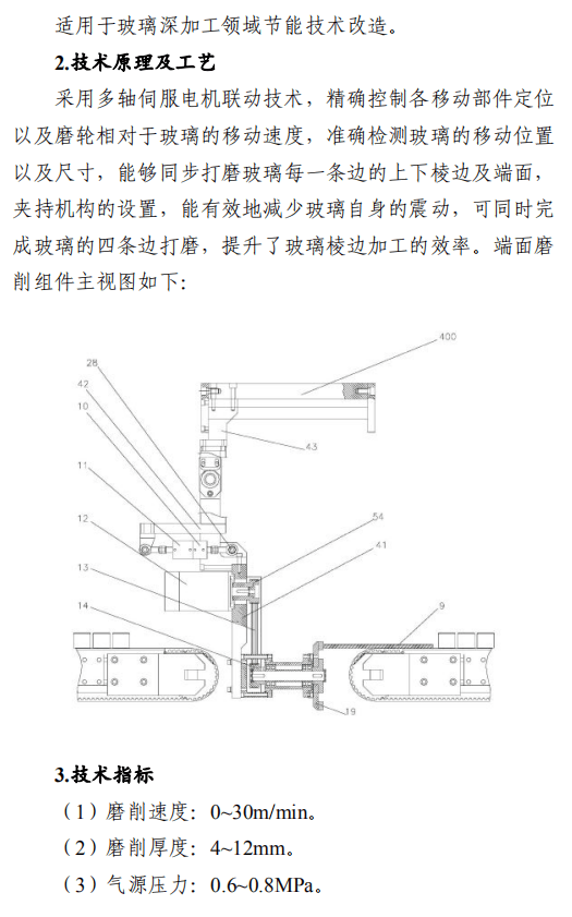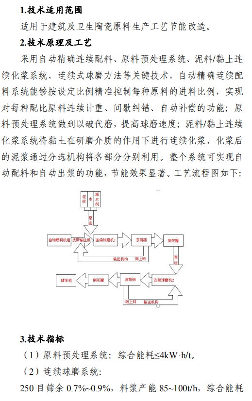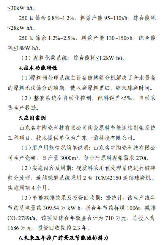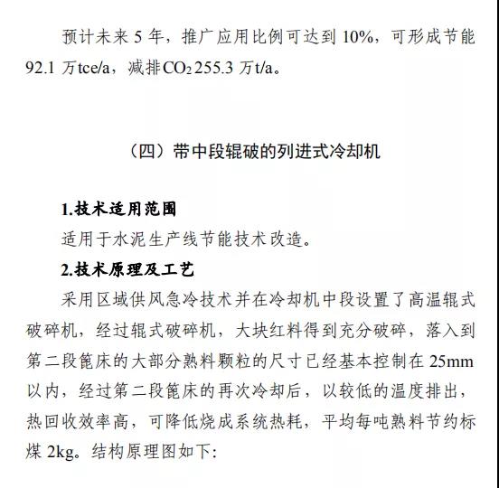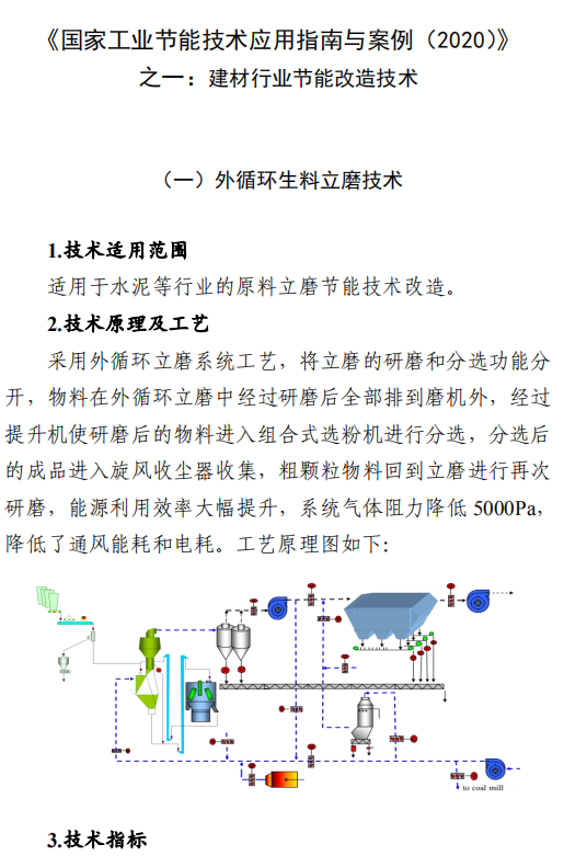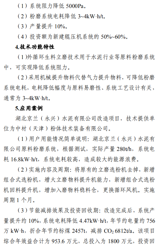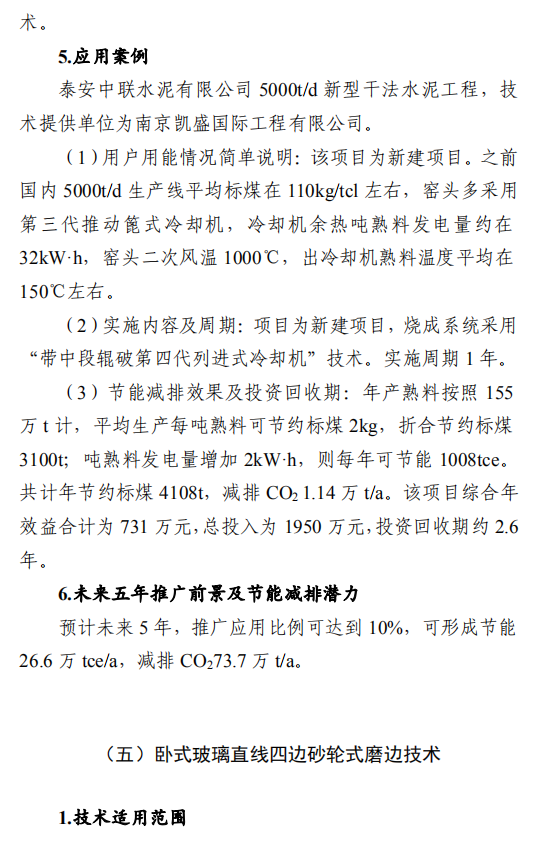 之一:建材行业节能改造技术外循环生料立磨节能技术,采用外循环立磨系统工艺,将立磨的研磨和分选功能分开,系统气体阻力降低5000Pa,通风能耗和电耗降低,粉磨系统电耗降低3-4kW·h/t,能源利用效率大幅提升。在湖北京兰(永兴)水泥有限公司改造项目中,系统产量提升约10%,系统电耗降低4.47kW·h/t,年节约电量约756万kW·h,折合年节约标煤2457t,减排二氧化碳6812t/a。钢渣/矿渣辊压机终粉磨系统节能技术,以辊压机和动静组合式选粉机为核心设备,辊面寿命可达立磨的2倍,具有广泛的物料适应性;全部物料为外循环,除铁方便,避免块状金属富集;系统阻力低,节电效果明显,矿渣微粉生产的系统电耗<35kW·h/t。在邯郸市邦信建材有限公司矿渣粉磨及储存(30万t/a)项目中,钢渣/矿渣辊压机终粉磨系统年节约电量约120万kW·h,折合年节约标煤390t,减排二氧化碳1081t/a。陶瓷原料连续制浆系统节能技术,采用自动精确连续配料、原料预处理系统、泥料/黏土连续化浆系统、连续式球磨方法等关键技术,实现自动配料和自动出浆的功能,原料预处理系统综合能耗≤4kW·h/t,250目筛余0.7%-0.9%、料浆产能85-100t/h连续球磨系统综合能耗≤30kW·h/t,泥料化浆系统综合能耗≤1.2kW·h/t,节能效果显著。山东名宇陶瓷科技有限公司陶瓷原料节能连续制浆系统改造项目,生产线年节约总电量约309.54万kW·h,折合年节约标煤1006t,减排二氧化碳2789t/a。带中段辊破的列进式冷却机节能技术,采用区域供风急冷技术并在冷却机中段设置了高温辊式破碎机,使大块红料得到充分破碎,落入到第二段篦床冷却后,以较低的温度排出,热回收效率高,可降低烧成系统热耗,平均每吨熟料节约标煤2kg。在泰安中联水泥有限公司5000t/d新型干法水泥工程项目中,系统运行稳定,年节约标煤4108t,减排二氧化碳1.14万t/a。卧式玻璃直线四边砂轮式磨边技术,采用多轴伺服电机联动技术,精确控制各移动部件定位以及磨轮相对于玻璃的移动速度,磨边速度15-30m/min,玻璃所需磨边时间平均20s/m2,可同时完成玻璃的四条边打磨,提升了玻璃棱边加工的效率。在广宇洛玻(北京)工业玻璃有限公司改造项目中,该项目年节约标煤46.8t,减排二氧化碳1170t/a。新型水泥熟料冷却技术及装备,采用新型前吹高效篦板、高效急冷斜坡、高温区细分供风、新型高温耐磨材料、智能化“自动驾驶”、新型流量调节阀等技术,热回收效率高、输送运转率高、磨损低。在涞水冀东水泥有限公司篦冷机改造项目中,吨熟料工序电耗下降2.57kW·h,每年可节电370万kW·h,折合标煤1202.5t,工序标煤耗下降2.81kg/tcl,每年可节约5100tce,余热发电年增加发电量570万kW·h,折合标煤1852.5t。综合年节约标煤8155t,减排二氧化碳2.26万t/a。