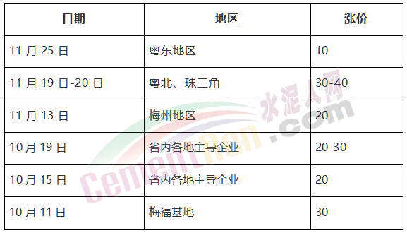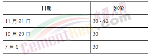 广东省在11月份全区域普遍上调10~40元/吨,部分厂家对P.C42.5水泥价格上调50元/吨;10月普涨20~30元/吨,熟料上调10元/吨。下半年以来两轮累计上调30~70元/吨。