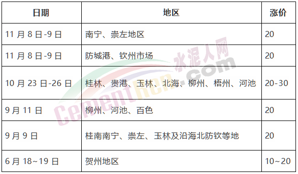 广西区域下半年以来,分别在6中下旬,9月中旬,10月下旬及11月中旬前后四次上调水泥价格,累计上调达90元/吨。极个别企业累计上调100元/吨以上。