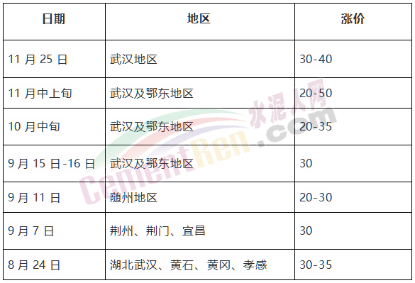 湖北地区武汉及鄂东地区分别在11月中上旬,11月下旬,10月中旬及9月中上旬、8月下旬分5次上调水泥价格,累计上调180元/吨。单位:元/吨