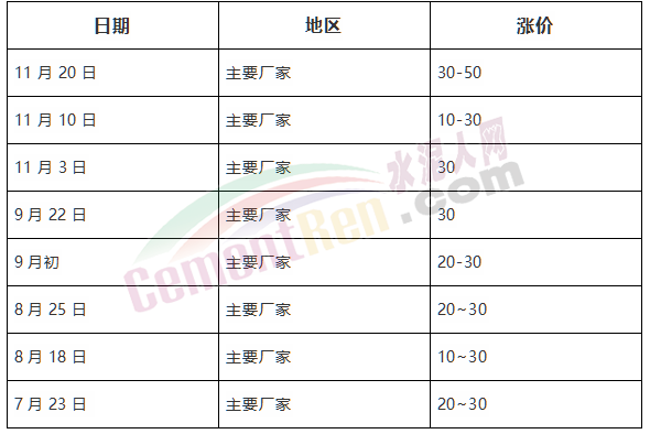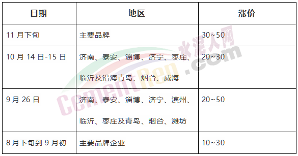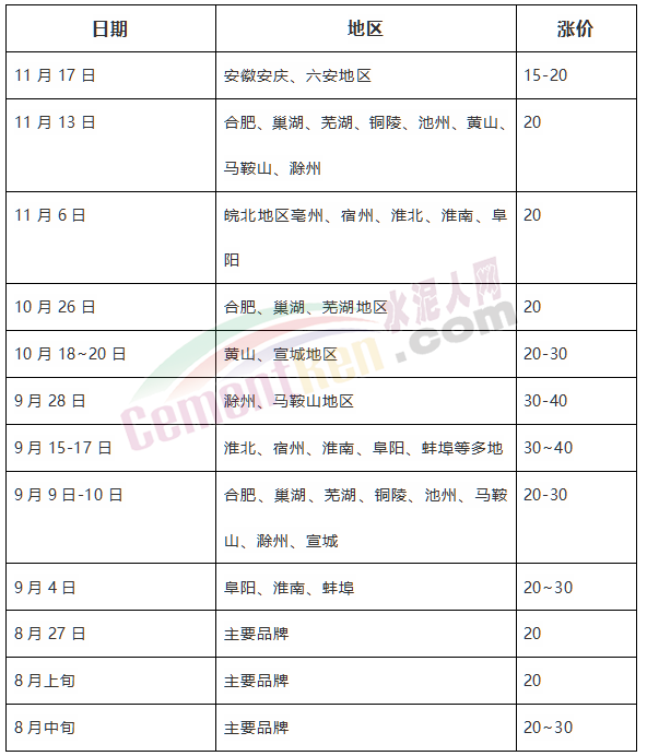 下半年以来安徽地区分别于8月份上旬、中旬、下旬;9月上旬、中下旬;以及11月上旬和中旬七次上调,累计上调达200~260元/吨。