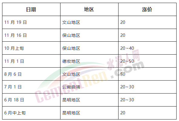 云南两轮累计上调50~70元/吨云南省内各区域普遍上调两轮,其中文山地区因淡季价格下滑严重,分别于8上旬和11月中下旬上调水泥价格累计上调50~70元/吨。其他区域普调40~50元/吨。
