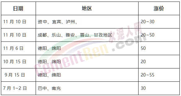 四川区域以德绵区域为主,自下半年以来已经连续三次上调水泥价格累计上调90~125元/吨。