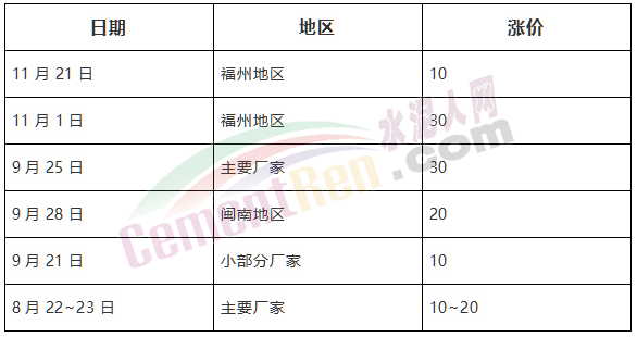 下半年以来福建地区分别在八月、九月及十一月中下旬上调水泥价格,三轮累计上涨60元/吨。