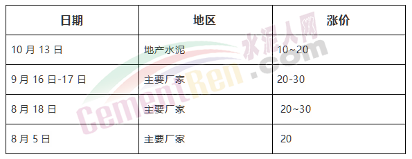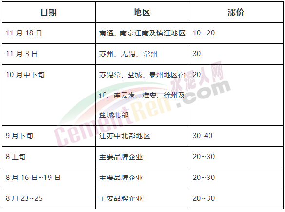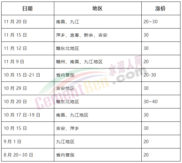 江西四轮连续上调120-130元/吨江西地区下半年以来从8月下旬开始调涨,分别在8月下旬至9月初、10月中正旬、11月初以及11月中下旬分四轮上调水泥价格,累计上调120~130元/吨。