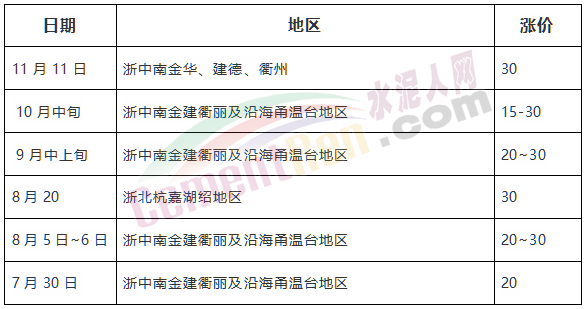 浙江省以上海周边地区为主,下半年以来分别在7月下旬,8月上旬、下旬,9月中上旬以及10月中旬和11月中旬分六次上调水泥价格,累计上调135~170元/吨。