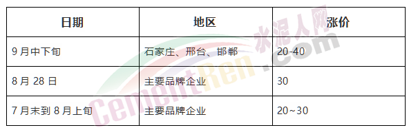 下半年以来,河南地区主要品牌企业已经连续八轮连涨累计上调最高达170~260元/吨,仅8月中旬到9月初水泥价格连续推涨四轮,幅度高达100~120元/吨。