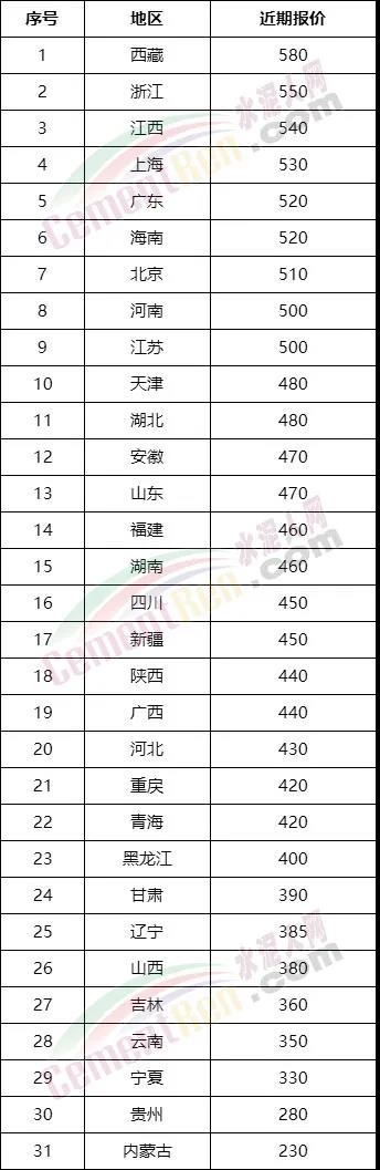 截止目前,最高价仍在西藏,浙江区域出厂均价达到550元/吨。最低价仍在内蒙古地区,最低均价达到230元/吨以下。
