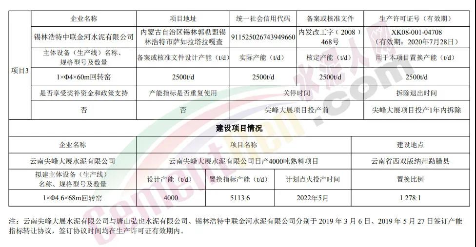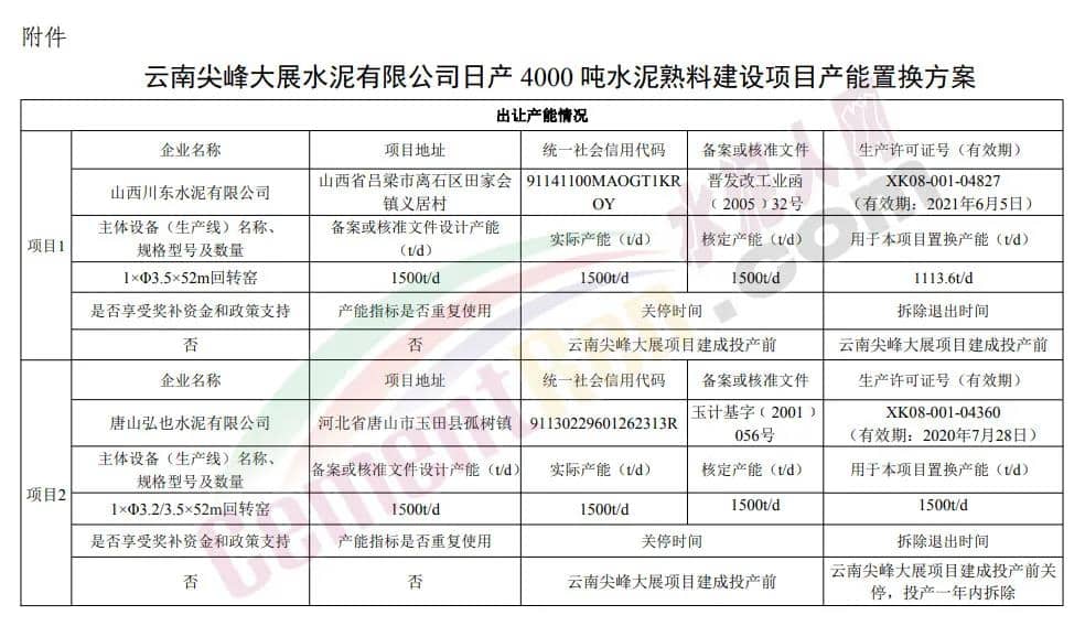 日前,云南工信厅发布《云南尖峰大展水泥有限公司日产4000吨熟料建设项目产能置换方案公示》称,按照相关文件要求,现将“云南尖峰大展水泥有限公司日产4000吨熟料建设项目产能置换方案”予以公示。公示期为2020年11月25日至12月8日。如有异议,请于公示期内向云南省工业和信息化厅反映,欢迎社会公众进行监督。公示文件全文如下: