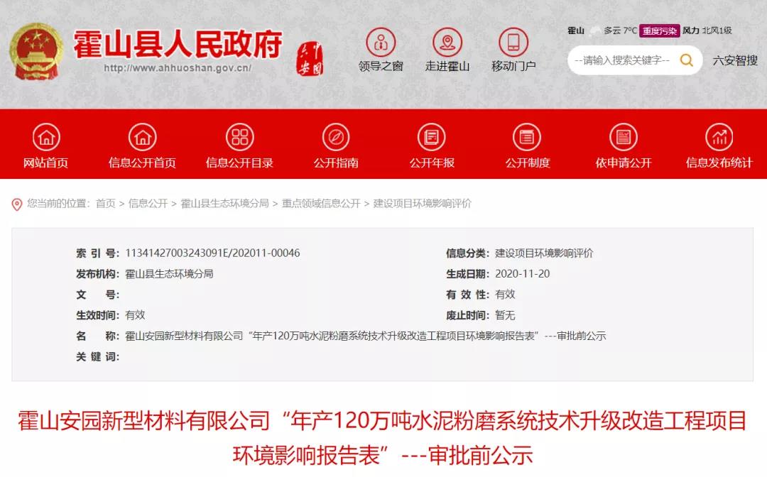 霍山县人民政府网发布《霍山安园新型材料有限公司“年产120万吨水泥粉磨系统技术升级改造工程项目环境影响报告表”---审批前公示发布》