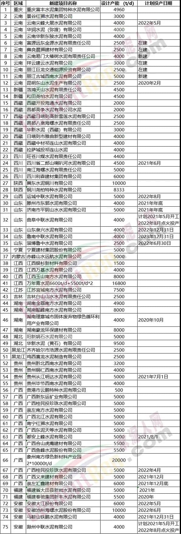 截止目前,包括已建成和在建项目国内已经有20条以上日产万吨水泥生产线了。据水泥人网不完全统计,近两年公示公告且在2020~2023年内投产的项目约75条生产线,产能合计共11087.79万吨/年。近日,又有15个新建粉磨站落地,项目投建方包括中联、西南、华新、尧柏等多家集团企业,合计产能共3355万吨/年,部分新建产能名单如下: