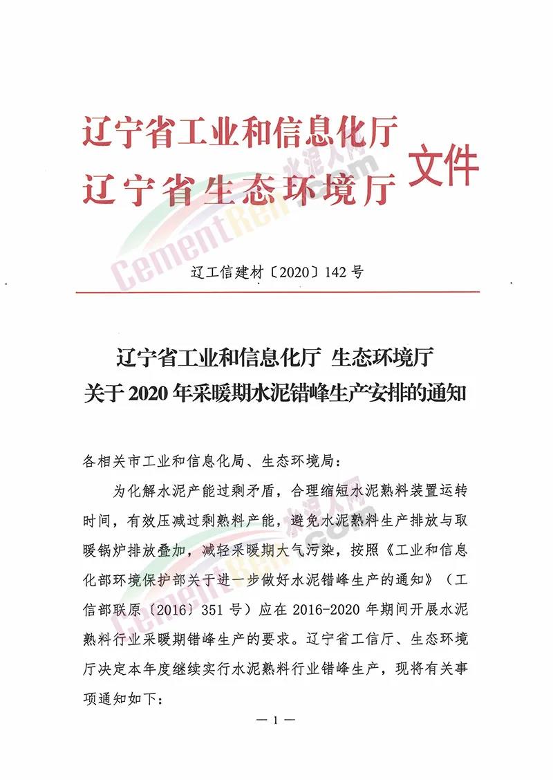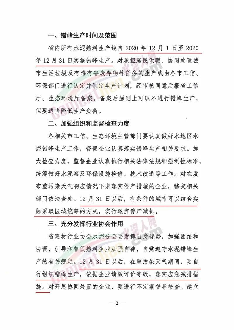 省内所有水泥熟料生产线自2020年12月1日至2020年12月31日实施错峰生产。对承担居民供暖、协同处置城市生活垃圾及有毒有害废弃物等任务的生产线由各市工信、环保部门进行认定并制定生产计划,经审核同意后报省工信厅、生态环境厅备案,备案后原则上可以不进行错峰生产,但要适当降低生产负荷。