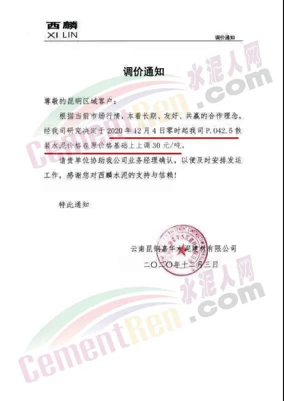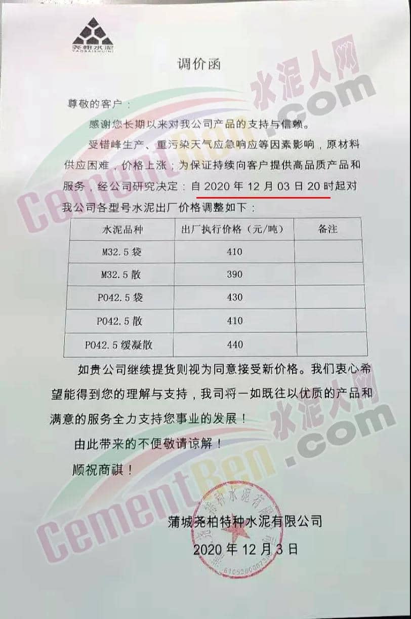 我公司从2020年12月3日14时起,针对P.O42.5散装水泥产品出厂价调整至最低405元/吨,其他产品在原价格基础上上调60元/吨。