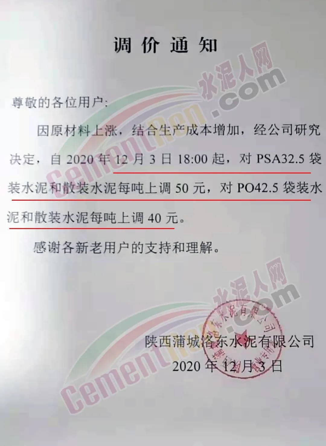 蒲城洛东水泥通知自12月3日下午18时起,对PSA32.5袋装水泥有散装水泥上调50元/吨,对PO42.5袋装水泥和散装水泥上调40元/吨。